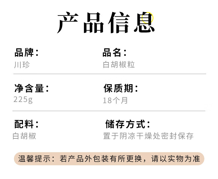 首页 > 调味调料 > 其它调味品 > 青川县白胡椒粒225g罐装调味料胡椒粒白胡椒