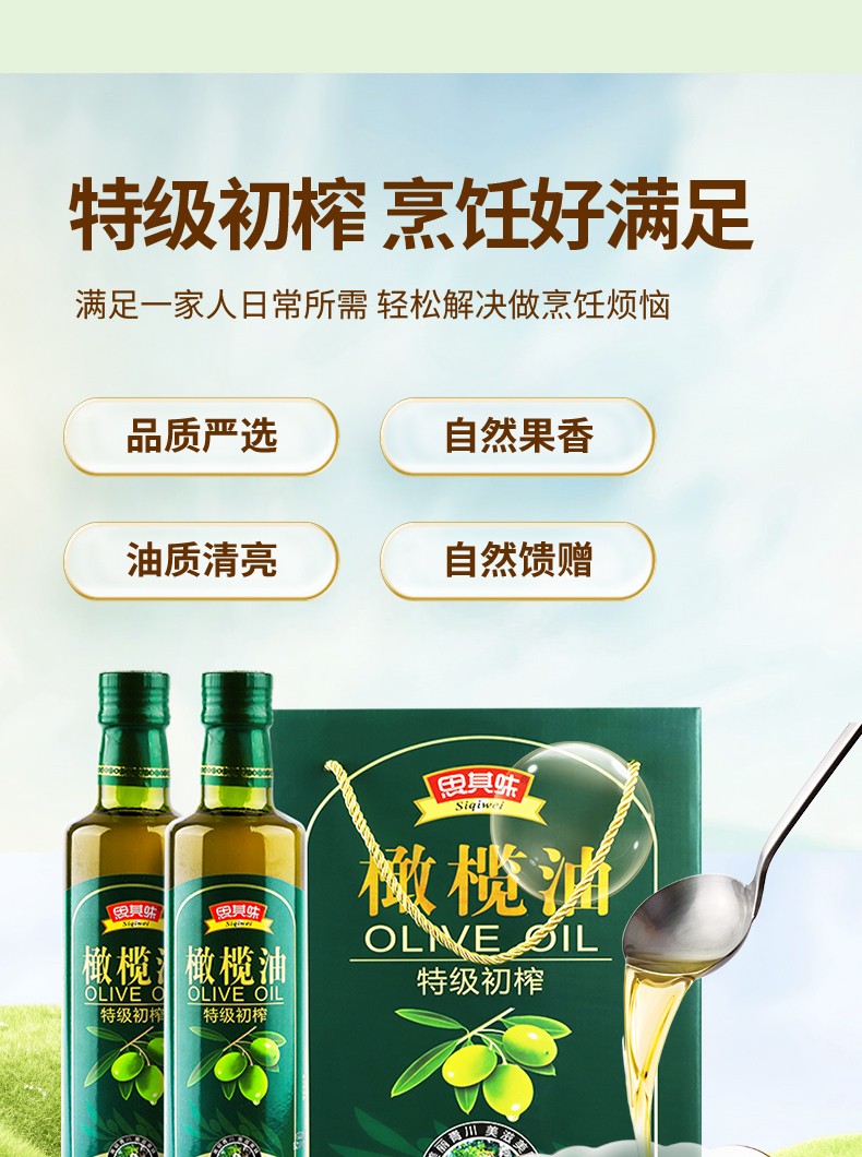 首页 > 米面粮油 > 橄榄油 > 青川县思其味特级初榨橄榄油500mlx2瓶/盒工会包邮